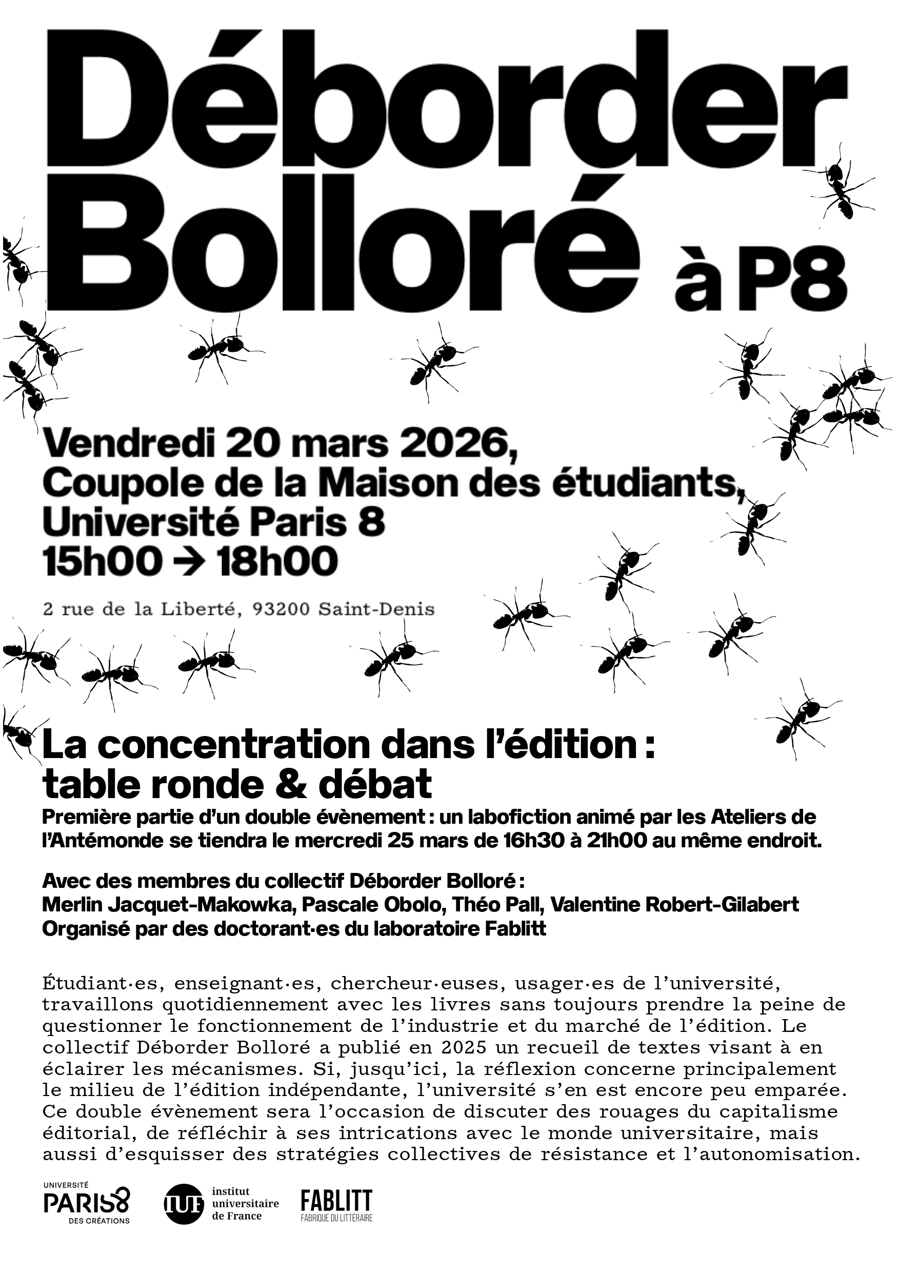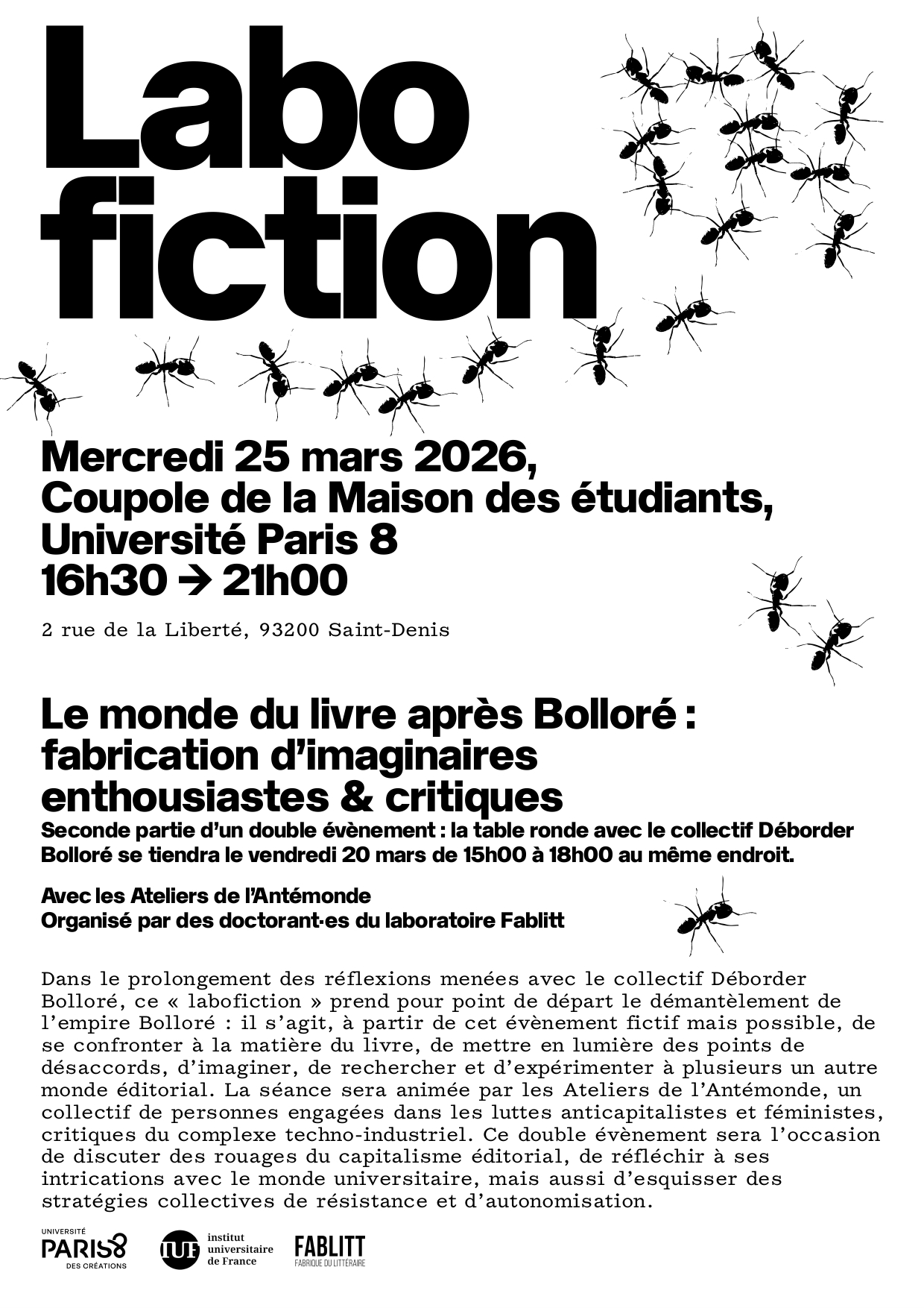 20 & 25 mars 2026 : table ronde avec le réseau Déborder Bolloré & labofiction avec les Ateliers de l’Antémonde
